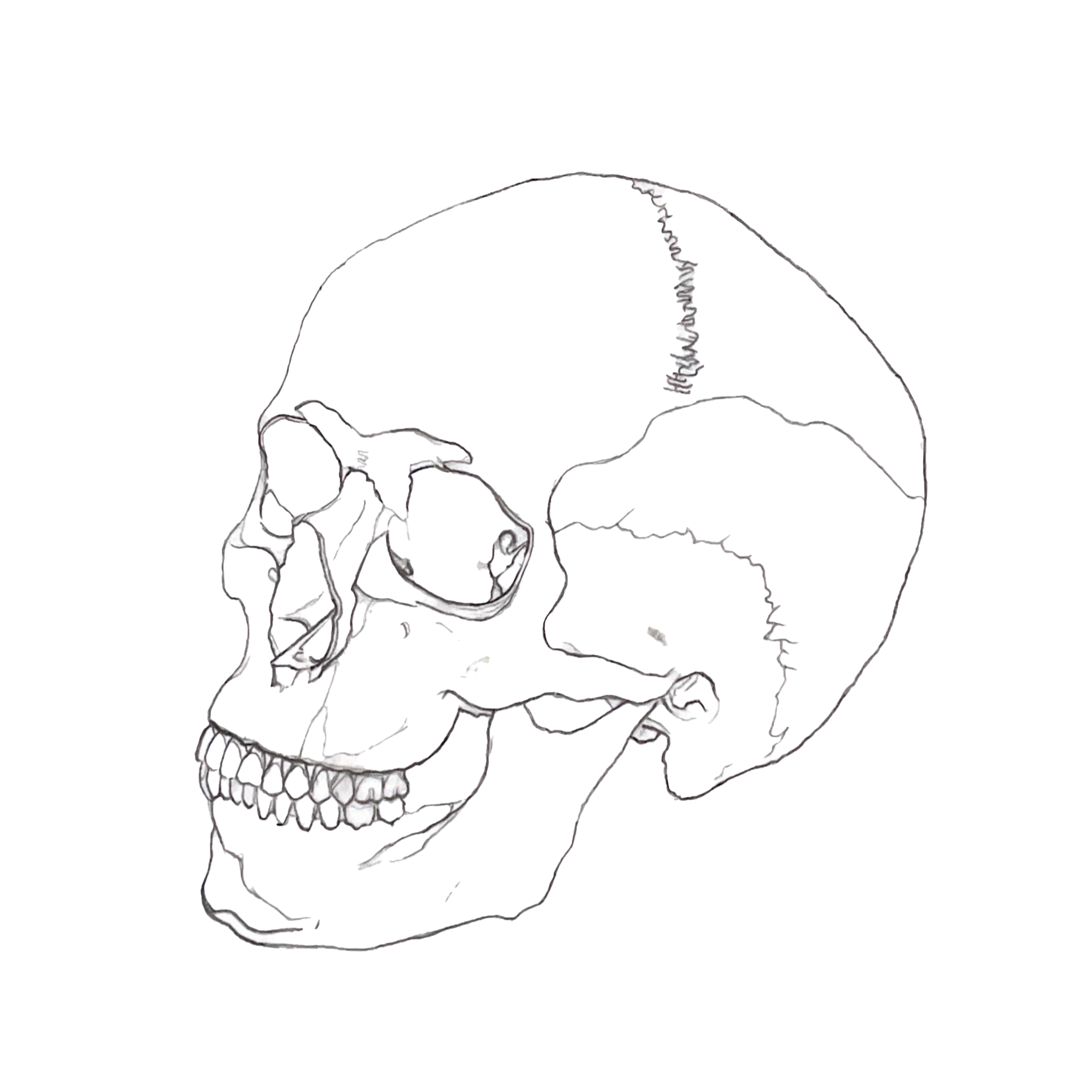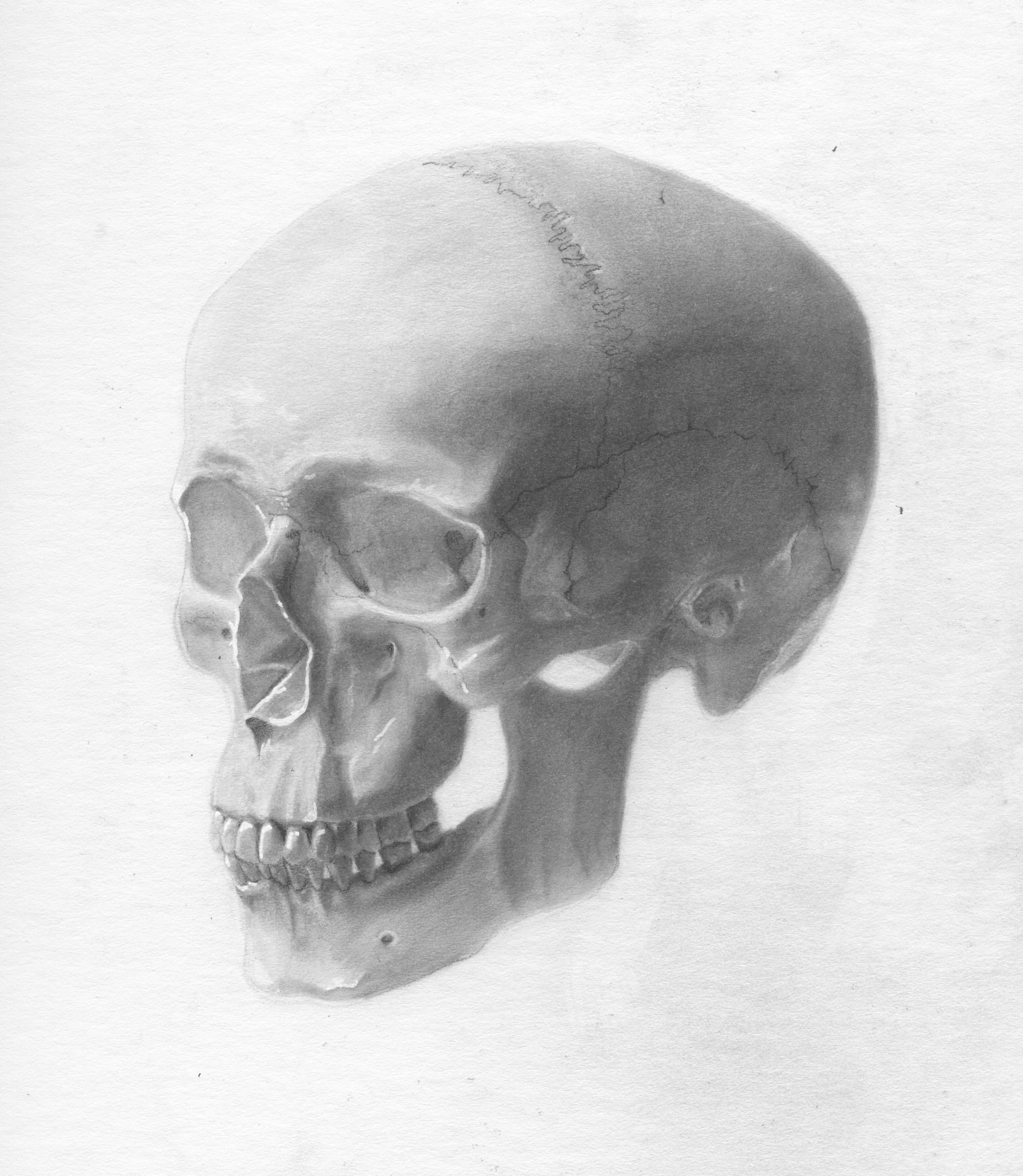 Create an anatomically accurate rendering of the human skull in carbon dust. Appropriately edit and label the final rendering for use by medical and anatomy students.
